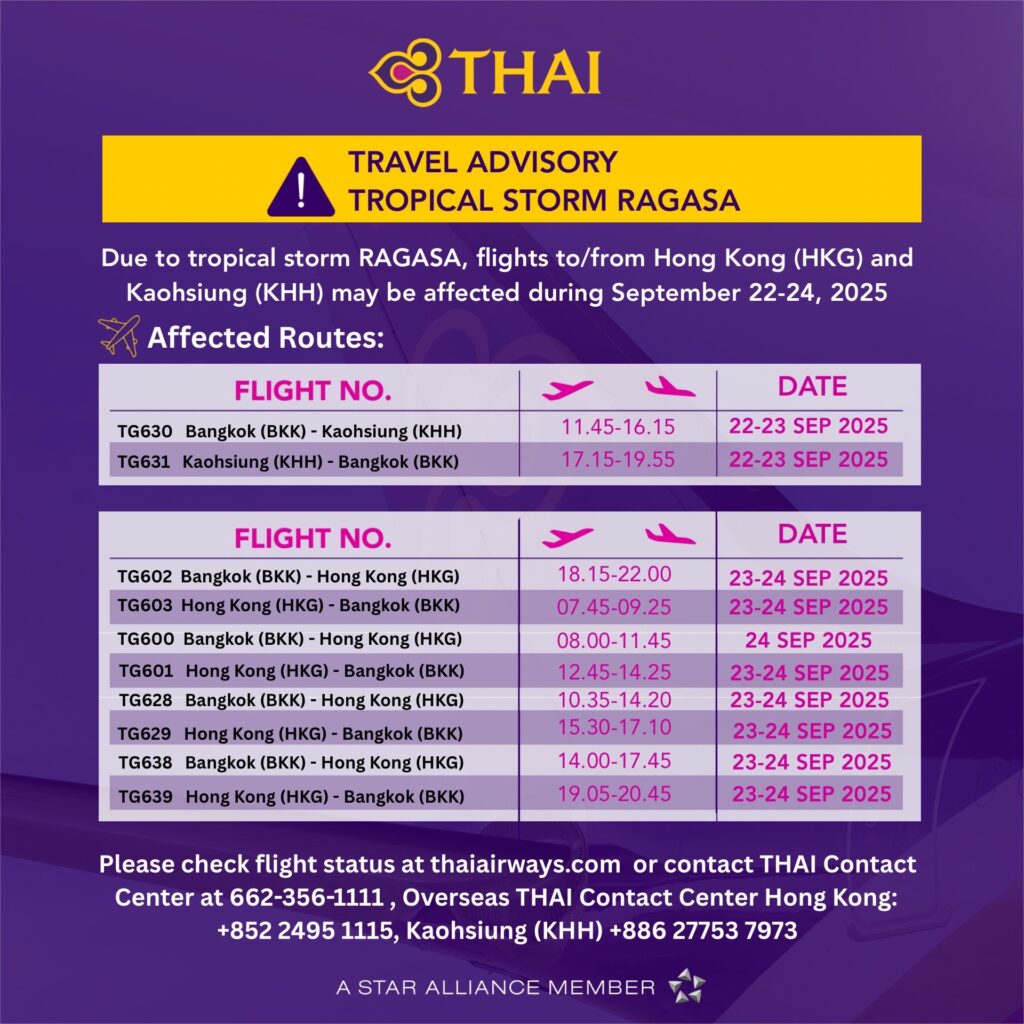 บริษัท การบินไทย จำกัด (มหาชน) ขอแจ้งให้ทราบว่า จากสถานการณ์พายุไต้ฝุ่น “รากาซา (RAGASA)” เคลื่อนตัวผ่านเกาะไต้หวันและเขตปกครองพิเศษฮ่องกง อาจส่งผลกระทบต่อเที่ยวบินของการบินไทยในเส้นทางไป–กลับ กรุงเทพฯ – เกาสง (ไต้หวัน) และกรุงเทพฯ – ฮ่องกง ระหว่างวันที่ 22–24 กันยายน 2568 โดยเที่ยวบินที่อาจได้รับผลกระทบมีดังนี้