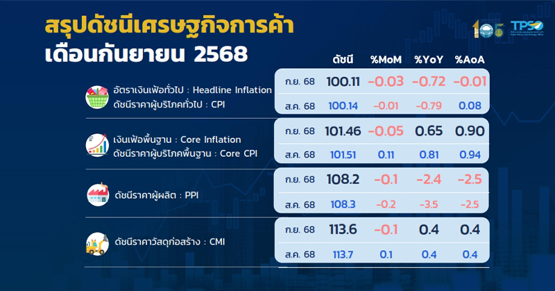 นายนันทพงษ์ จิระเลิศพงษ์ ผู้อำนวยการสำนักงานนโยบายและยุทธศาสตร์การค้า เผยว่า ดัชนีราคาผู้บริโภคทั่วไปของไทย เดือนกันยายน 2568 เท่ากับ 100.11 เมื่อเทียบกับเดือนกันยายน 2567 ซึ่งเท่ากับ 100.84 ทำให้อัตรา เงินเฟ้อทั่วไปลดลงร้อยละ 0.72 (YoY) โดยปัจจัยหลักมาจากราคาสินค้ากลุ่มพลังงานลดลง ทั้งค่ากระแสไฟฟ้าและน้ำมันเชื้อเพลิงตามนโยบายของภาครัฐ และราคาพลังงานในตลาดโลกที่ปรับตัวลดลง ประกอบกับราคาสินค้าสำคัญในกลุ่มอาหารสดยังคงลดลงเมื่อเทียบกับปีที่ผ่านมา โดยเฉพาะไข่ไก่ ผักสด และผลไม้สด สำหรับราคาสินค้าและบริการอื่น ๆ ส่งผลกระทบต่อภาวะเงินเฟ้อไม่มากนัก