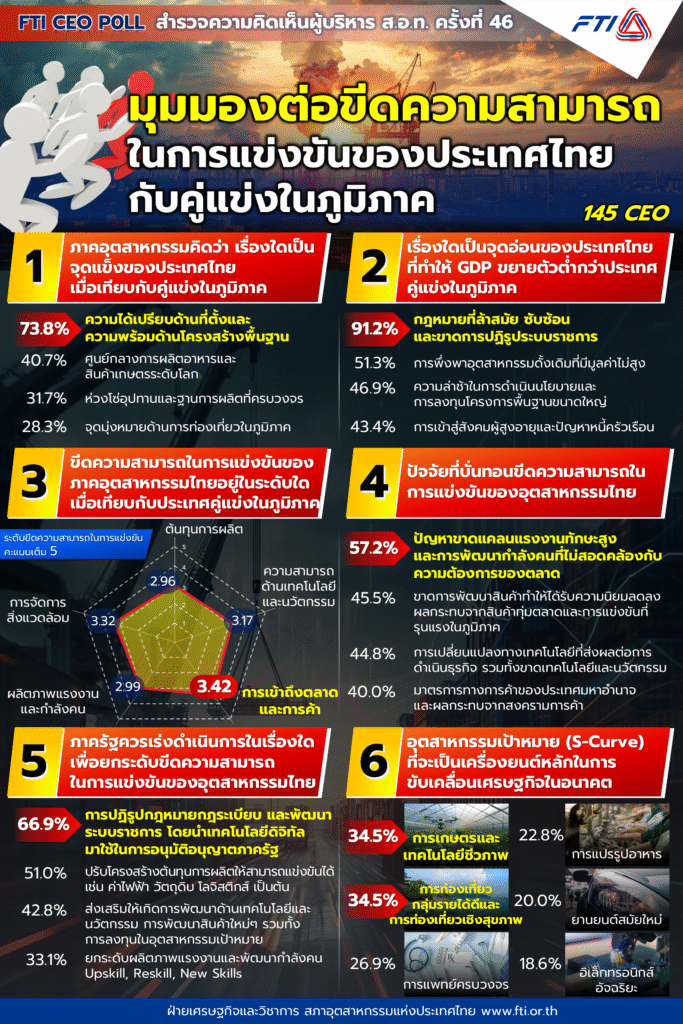 จากการสำรวจผู้บริหาร ส.อ.ท. (CEO Survey) จำนวน 145 ท่าน ครอบคลุม 47 กลุ่มอุตสาหกรรม และ 76 สภาอุตสาหกรรมจังหวัด สามารถสรุปผลการสำรวจ FTI CEO Poll ครั้งที่ 46 จาก 6 คำถามได้ดังนี้