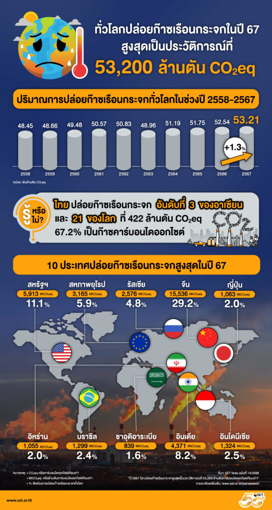 สุมิตรา ตั้งสมวรพงษ์ ฝ่ายวิจัย ตลาดหลักทรัพย์แห่งประเทศไทย (ตลท.) ประเมินว่า จากรายงาน GHG Emissions of All World Countries 2025 Report ที่จัดทำโดย Joint Research Centre (JRC) สหภาพยุโรป ได้รายงานปริมาณการปล่อยก๊าซเรือนกระจกของทุกประเทศทั่วโลกที่เกิดขึ้นในปี 2567 เมื่อวันที่ 9 กันยายน 2568 ที่ผ่านมา พบว่า