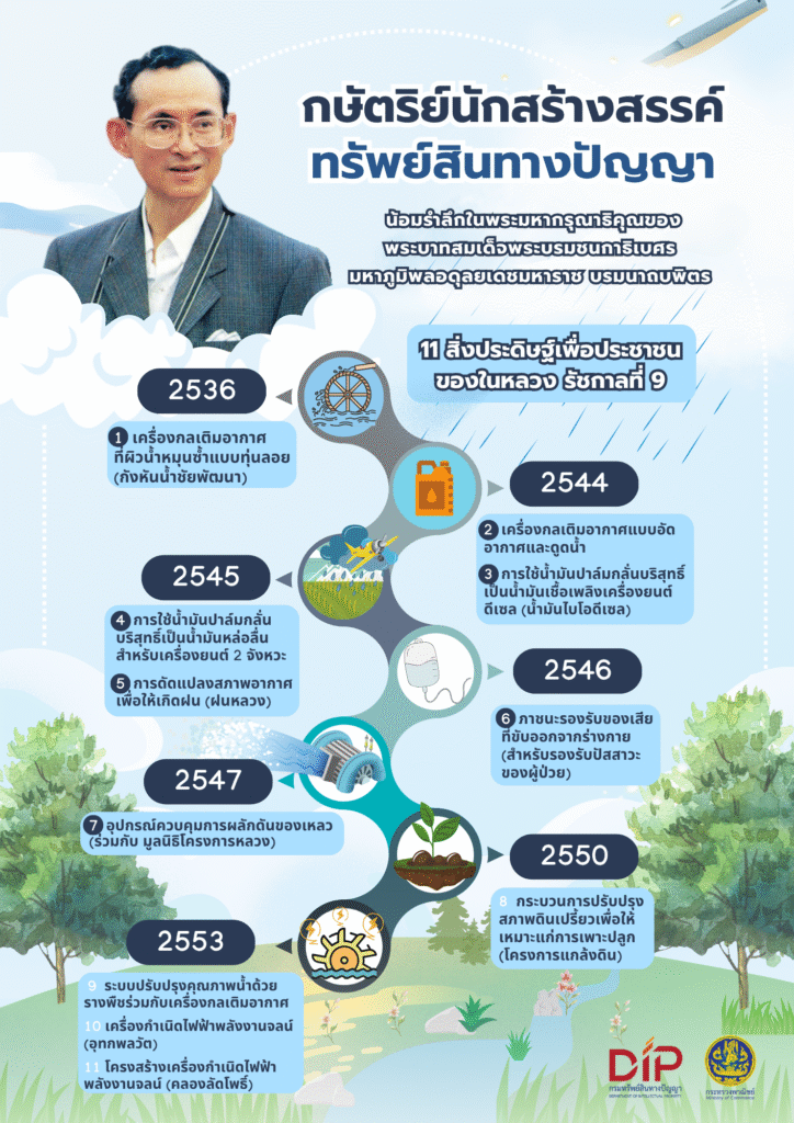 นางอรมน ทรัพย์ทวีธรรม อธิบดีกรมทรัพย์สินทางปัญญา เปิดเผยว่า กว่า 70 ปีที่พระบาทสมเด็จพระบรมชนกาธิเบศร มหาภูมิพลอดุลยเดชมหาราช บรมนาถบพิตร ทรงครองสิริราชสมบัติ พระองค์ได้ทรงงานและบำเพ็ญพระราชกรณียกิจนานัปการ ซึ่งเป็นส่วนสำคัญในการพัฒนาด้านสังคม เศรษฐกิจ และการเกษตรของประเทศ อีกทั้งยังทรงให้ความสำคัญของเรื่องทรัพย์สินทางปัญญาเป็นอย่างยิ่ง ดังพระราชดำรัสที่พระราชทานแก่รัฐมนตรีว่าการกระทรวงพาณิชย์และคณะ ในโอกาสเข้าเฝ้าฯ ทูลเกล้าฯ ถวายสิทธิบัตร “เครื่องกลเติมอากาศแบบอัดอากาศและดูดน้ำ” เมื่อวันศุกร์ที่ 5 ตุลาคม 2544 ณ พระตำหนักเปี่ยมสุข วังไกลกังวล ซึ่งมีความตอนหนึ่งว่า “ทรัพย์สินทางปัญญาเป็นเรื่องที่เกิดขึ้นมานานแล้ว สิทธิบัตรและลิขสิทธิ์เป็นทรัพย์สินทางปัญญาที่มีความสำคัญมาก เมื่อตอนปี พ.ศ.2500 พูดกันว่า เราไปลอกจากต่างประเทศมาใช้ประโยชน์ได้มากกว่าคิดที่จะจดทะเบียนสิทธิบัตร เราสามารถใช้อะไรจากต่างประเทศได้ โดยไม่ต้องเสียค่าใช้สิทธิ การพูดอย่างนี้ไม่ถูก เป็นการดูถูกคนไทย” โดยแนวคิดดังกล่าวได้สร้างแรงบันดาลใจให้แก่นักคิดนักประดิษฐ์ในการสร้างสรรค์นวัตกรรมและทรัพย์สินทางปัญญาเพื่อขับเคลื่อนประเทศให้เจริญก้าวหน้ามาจวบจนปัจจุบัน