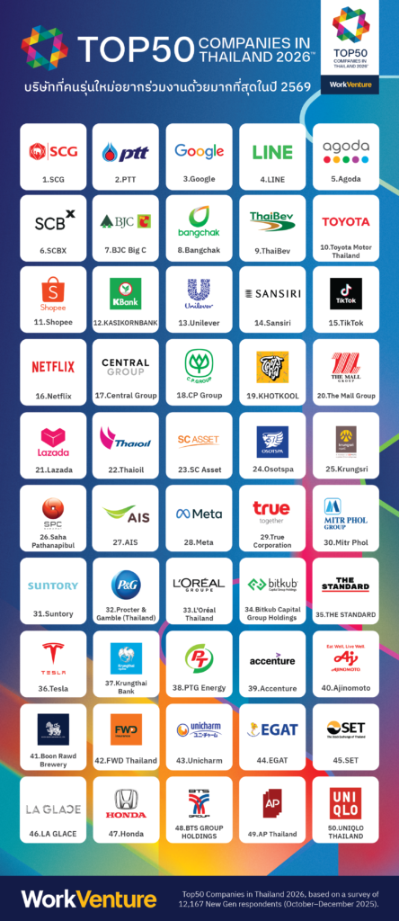 ผู้สนใจสามารถติดตามผลการจัดอันดับ 50 บริษัทที่คนรุ่นใหม่อยากร่วมงานด้วยมากที่สุดในปี 2569 และบทวิเคราะห์เจาะลึกฉบับเต็มได้ที่ https://top50.workventure.com/2026