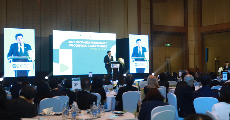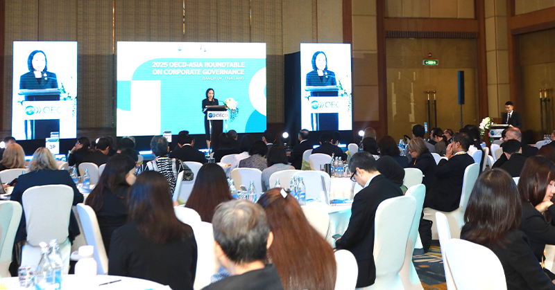 สำนักงานคณะกรรมการกำกับหลักทรัพย์และตลาดหลักทรัพย์ (ก.ล.ต.) ตลาดหลักทรัพย์แห่งประเทศไทย และองค์การเพื่อความร่วมมือทางเศรษฐกิจและการพัฒนา (OECD) ได้ร่วมกันจัดงานประชุม OECD-Asia Roundtable on Corporate Governance 2025 ซึ่งเป็นเวทีระดับภูมิภาคระหว่างประเทศในเอเชียและ OECD เพื่อส่งเสริมการแลกเปลี่ยนเชิงนโยบายด้านบรรษัทภิบาล การระดมทุนและความยั่งยืนของภาคธุรกิจ โดยการประชุมครั้งนี้มีผู้เข้าร่วมกว่า 150 คน จาก 23 ประเทศ ประกอบไปด้วย ผู้บริหารระดับสูงและผู้แทนจากหน่วยงานภาครัฐและเอกชนทั้งในประเทศและต่างประเทศ เพื่อร่วมแลกเปลี่ยนประสบการณ์และแนวปฏิบัติที่ดีในการกำกับดูแลกิจการและความยั่งยืนขององค์กร