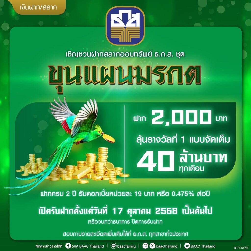 นายฉัตรชัย ศิริไล ผู้จัดการธนาคารเพื่อการเกษตรและสหกรณ์การเกษตร (ธ.ก.ส.) กล่าวว่า ธนาคารจะออกสลากชุดใหม่ชื่อขุนแผนมรกต หน่วยละ 2,000 บาท อายุสลากฯ 2 ปี ชิงรางวัลที่หนึ่ง 40 ล้านบาท ทุกงวด
