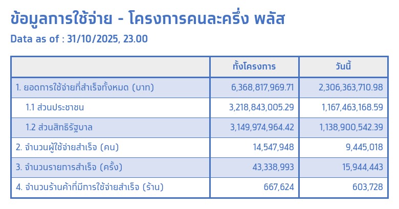 นายลวรณ แสงสนิท ปลัดกระทรวงการคลัง เปิดเผยว่า การใช้จ่ายโครงการ คนละครึ่งพลัส วันที่ 3 (วันที่ 31 ต.ค. 2568) ณ เวลา 23.00 น. พบว่า