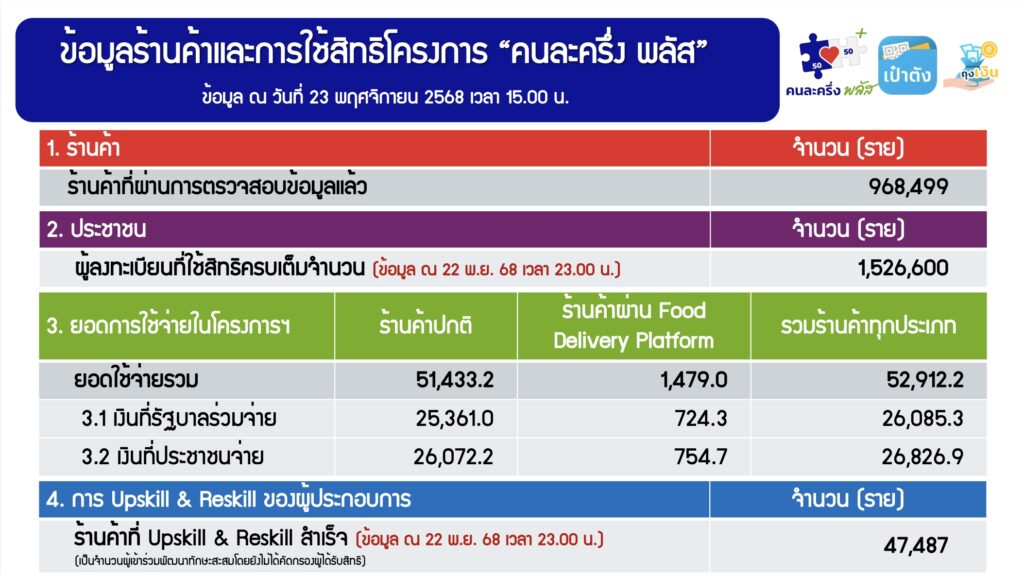 นายลวรณ กล่าวว่า ในส่วนของร้านค้า เข้าร่วมโครงการ คนละครึ่งพลัส 9.68 แสนร้านค้า มีร้านค้าที่เข้าโครงการเสริมทักษะสำเร็จแล้ว 4.74 หมื่นล้านค้า ทำให้จะได้เงินเพิ่มจากรัฐ 20% ของยอดขาย แต่ไม่เกิน 2,000 บาท โดยรัฐบาลเปิดให้สิทธิทั้งหมด 4 แสนสิทธิ ร้านค้าสามารถเข้าโครงการอบรมเสริมทักษาแผ่นแอปของธนาคารออมสิน และกระทรวงพาณิชย์ หรือสมัครเข้าขายผ่านแพตฟอร์มฟู้ดเดลิเวอรี่ที่ร่วมในโครงการคนละครึ่งพลัส ได้ถึงวันที่ 19 ธ.ค. 2568