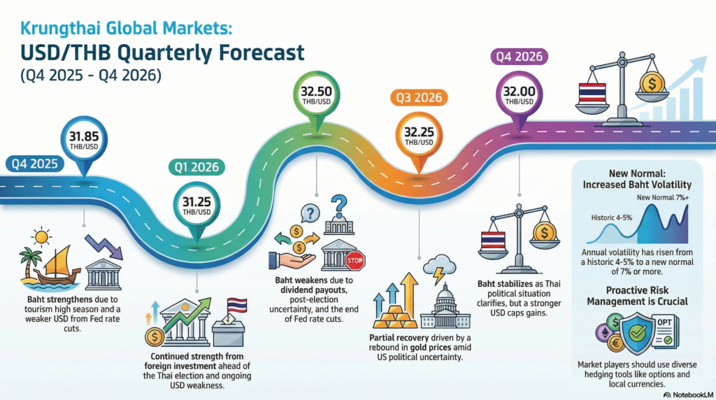 สำหรับ แนวโน้มเงินบาท เนื่องจากประเทศไทยได้เข้าสู่ช่วงไฮซีซั่นของการท่องเที่ยว อีกทั้งเรายังคงประเมินว่า เฟดยังมีแนวโน้มเดินหน้าลดดอกเบี้ยในการประชุมเดือนธันวาคมนี้ ทำให้เราประเมินว่า เงินบาท (USDTHB) มีแนวโน้มทยอยแข็งค่าขึ้นในลักษณะ Sideways Down และอาจจบสิ้นปี 2025 แถวโซน 32.00 บาทต่อดอลลาร์ (หรือแข็งค่ากว่าระดับดังกล่าวเล็กน้อย) ได้ ทว่าเงินบาทยังคงเผชิญความเสี่ยง Two-Way Risk (พร้อมเคลื่อนไหวได้ทั้งสองทิศทาง) ไม่ต่างกับเงินดอลลาร์ ขึ้นกับการปรับเปลี่ยนมุมมองของผู้เล่นในตลาดต่อแนวโน้มการปรับดอกเบี้ยนโยบายของเฟด ซึ่งต้องรอลุ้นรายงานข้อมูลเศรษฐกิจสำคัญของสหรัฐฯ ที่จะทยอยประกาศออกมา รวมถึงไฮไลท์สำคัญ อย่างผลการประชุม FOMC ของเฟด ว่าจะมีมติอย่างไร และแนวโน้มการปรับดอกเบี้ยนโยบาย หรือ Dot Plot มีการปรับเปลี่ยนอย่างไรบ้าง อนึ่ง หากเงินบาทมีจังหวะอ่อนค่า ก็อาจยังไม่สามารถผ่านโซนแนวต้าน 32.30-32.50 บาทต่อดอลลาร์ ไปได้ง่ายนัก ท่ามกลางแรงขายเงินดอลลาร์จากผู้เล่นในตลาด ทั้งนี้ เรามองว่า ควรจับตาทิศทางการเคลื่อนไหวของราคาทองคำ ฟันด์โฟลว์นักลงทุนต่างชาติ รวมถึงการเคลื่อนไหวของเงินหยวนจีน (CNY) ที่อาจส่งผลกระทบต่อเงินบาทได้พอสมควรในช่วงที่เหลือของปีนี้
