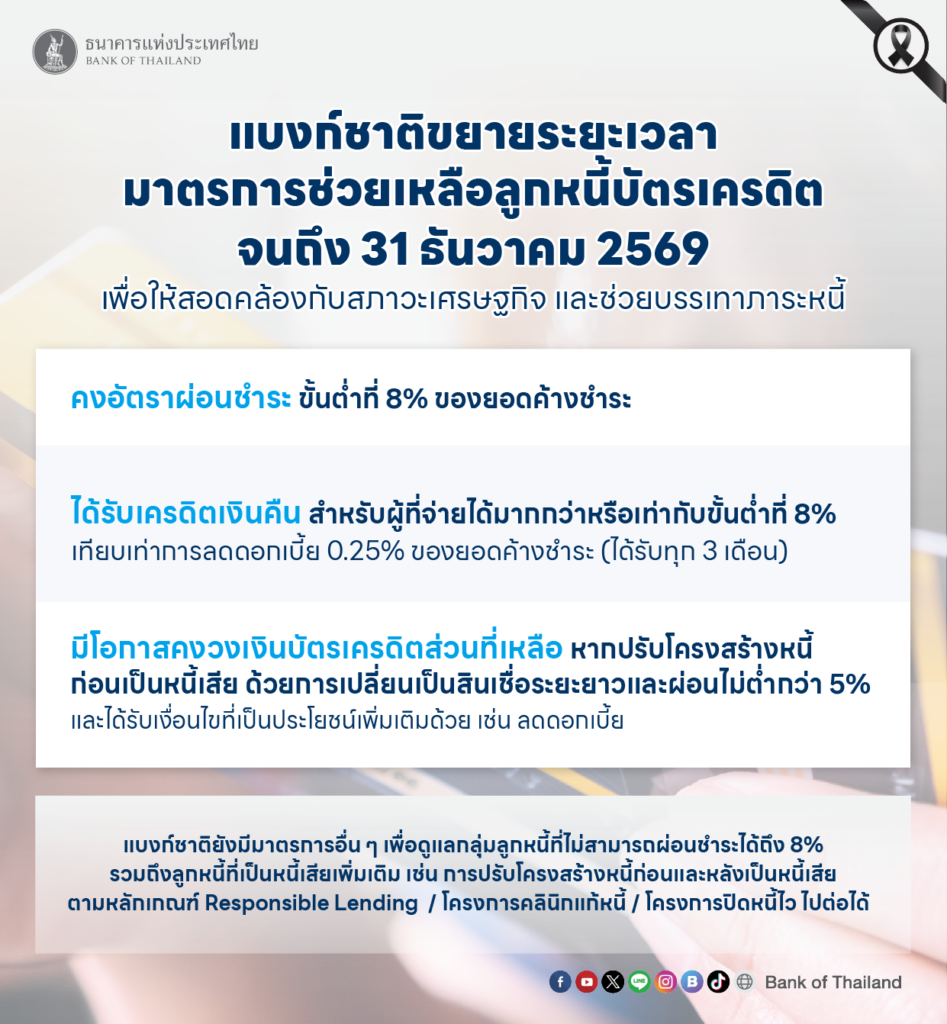 ธนาคารแห่งประเทศไทย (ธปท.) ได้ออกมาตรการทางการเงินอย่างต่อเนื่อง เพื่อช่วยบรรเทาปัญหาหนี้ครัวเรือน รวมถึงหนี้บัตรเครดิต อย่างไรก็ดี ยังมีลูกหนี้กลุ่มเปราะบางที่ต้องการความช่วยเหลือเพิ่มเติม เนื่องจากรายได้ยังฟื้นตัวไม่เต็มที่ ซึ่งอาจส่งผลกระทบต่อสภาพคล่องและความสามารถในการผ่อนชำระหนี้ ในการนี้ ธปท. จึงเห็นควรขยายระยะเวลามาตรการช่วยเหลือลูกหนี้บัตรเครดิตออกไปจนถึงสิ้นปี 2569 จากเดิมที่จะมีผลสิ้นสุดในวันที่ 31 ธันวาคม 2568 โดยมีรายละเอียด ดังนี้