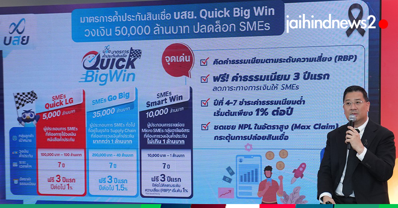 นายสิทธิกร ดิเรกสุนทร กรรมการและผู้จัดการทั่วไป บรรษัทประกันสินเชื่ออุตสาหกรรมขนาดย่อม (บสย.) กล่าวว่า มาตรการค้ำประกันสินเชื่อ Quick Big Win วงเงิน 50,000 ล้านบาท มาตรการใหม่ล่าสุดจาก บสย. มุ่งช่วย SMEs ทุกกลุ่มสามารถเข้าถึงสินเชื่อง่ายขึ้น ลดต้นทุนทางการเงินให้กับ SMEs ฟรี ค่าธรรมเนียมค้ำประกัน 3 ปีแรก ชำระค่าธรรมเนียมต่ำเริ่มต้นเพียง 1% ต่อปี ตามวงเงินคงเหลือในปีที่ 4 พร้อมคิดค่าธรรมเนียมตามระดับความเสี่ยง (RBP) โดยใช้ บสย. Credit Scoring และชดเชย NPL ในอัตราสูง (Max Claim) เพื่อกระตุ้นการปล่อยสินเชื่อให้ SMEs มากยิ่งขึ้น