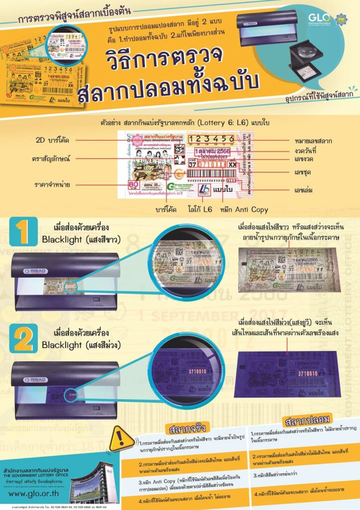อย่างไรก็ตาม ผู้ซื้อสามารถตรวจสอบลักษณะทางกายภาพของสลาก เช่น เนื้อกระดาษ หมึก Anti Copy ลายน้ำ ตามที่สำนักงานสลากกินแบ่งรัฐบาลได้แนะนำไว้ในเว็บไซต์ www.glo.or.th อย่างครบถ้วนอีกด้วย”
