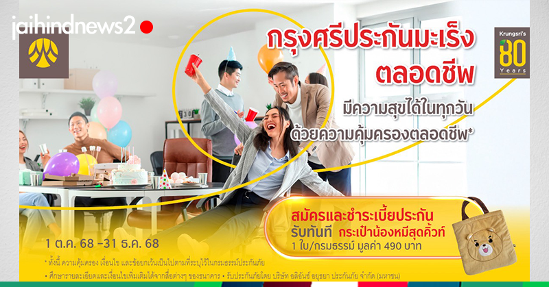 กรุงศรี (ธนาคารกรุงศรีอยุธยา จำกัด (มหาชน)) มอบสิทธิพิเศษสำหรับลูกค้าที่สมัครและชำระเบี้ย กรุงศรีประกันมะเร็ง ตลอดชีพ 4,000 บาท ขึ้นไปต่อกรมธรรม์ ผ่านสาขาธนาคารกรุงศรีอยุธยา รับทันที กระเป๋าน้องหมีสุดคิ้วท์ 1 ใบต่อกรมธรรม์ มูลค่า 490 บาท ตั้งแต่วันที่ 1 ตุลาคม 2568 – 31 ธันวาคม 2568
