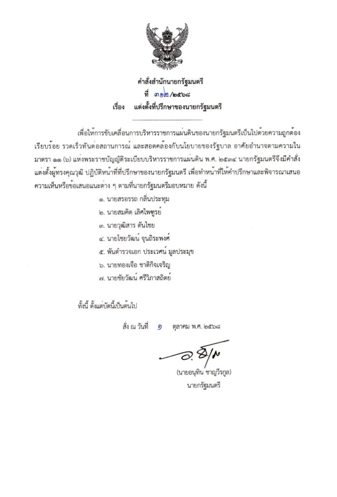 วันที่ 9 ต.ค. ผู้สื่อข่าวรายงานว่า เมื่อวันที่ 1 ต.ค.ที่ผ่านมา นายอนุทิน ชาญวีรกูล นายกรัฐมนตรีและรมว.มหาดไทย ลงนามคำสั่งนายกรัฐมนตรีเรื่องการแต่งตั้งที่ปรึกษา มีเนื้อหาว่า คำสั่งสำนักนายกรัฐมนตรี ที่ 312/2568 เรื่อง แต่งตั้งที่ปรึกษาของนายกรัฐมนตรี เพื่อให้การขับคลื่อนการบริหาราชการแผ่นดินของของนายกรัฐมนตรีเป็นไปด้วยความถูกต้อง เรียบร้อย รวดเร็วทันต่อสถานการณ์ และสอดคล้องกับนโยบายของรัฐบาล อาศัยอำนาจตามความใน มาตรา 11 (6) แห่งพระราชบัญญัติระเบียบบริหารราชการแผ่นดิน พ.ศ. 2534 นายกรัฐมนตรีจึงมีคำสั่งแต่งตั้งผู้ทรงคุณวุฒิ ปฏิบัติหน้าที่ที่ปรึกษาของนายกรัฐมนตรี เพื่อทำหน้าที่ให้คำปรึกษาและพิจารณาเสนอความเห็นหรือข้อเสนอแนะต่าง ๆ ตามที่นายกรัฐมนตรีมอบหมาย ดังนี้