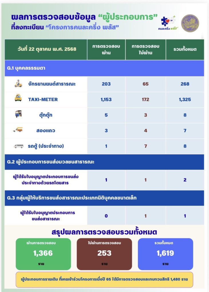 จากข้อมูลการตรวจสอบล่าสุด พบว่ากลุ่มที่เข้าร่วมมากที่สุด ได้แก่รถ TAXI-METER จำนวน 1,325 ราย (ผ่านการตรวจสอบแล้ว 1,153 ราย) จักรยานยนต์สาธารณะ 268 ราย (ผ่านแล้ว 203 ราย) รวมถึงรถตุ๊กตุ๊ก รถสองแถว และรถตู้โดยสารประจำทาง ซึ่งอยู่ระหว่างการตรวจสอบข้อมูลเพิ่มเติม