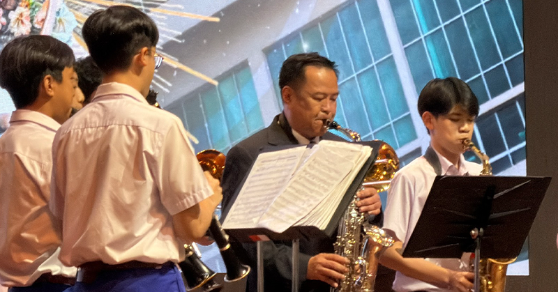 ก่อนที่นายอนุทินร่วมเล่นแซกโซโฟนกับวงดุริยางค์โรงเรียนอัสสัมชัญ (AC Band) ในเพลงสดุดีอัสสัมชัญ และเพลง Stars and Stripes Forever  ซึ่งนายกฯเคยเป็นสมาชิกของวงดังกล่าวเมื่อครั้งที่ศึกษาอยู่