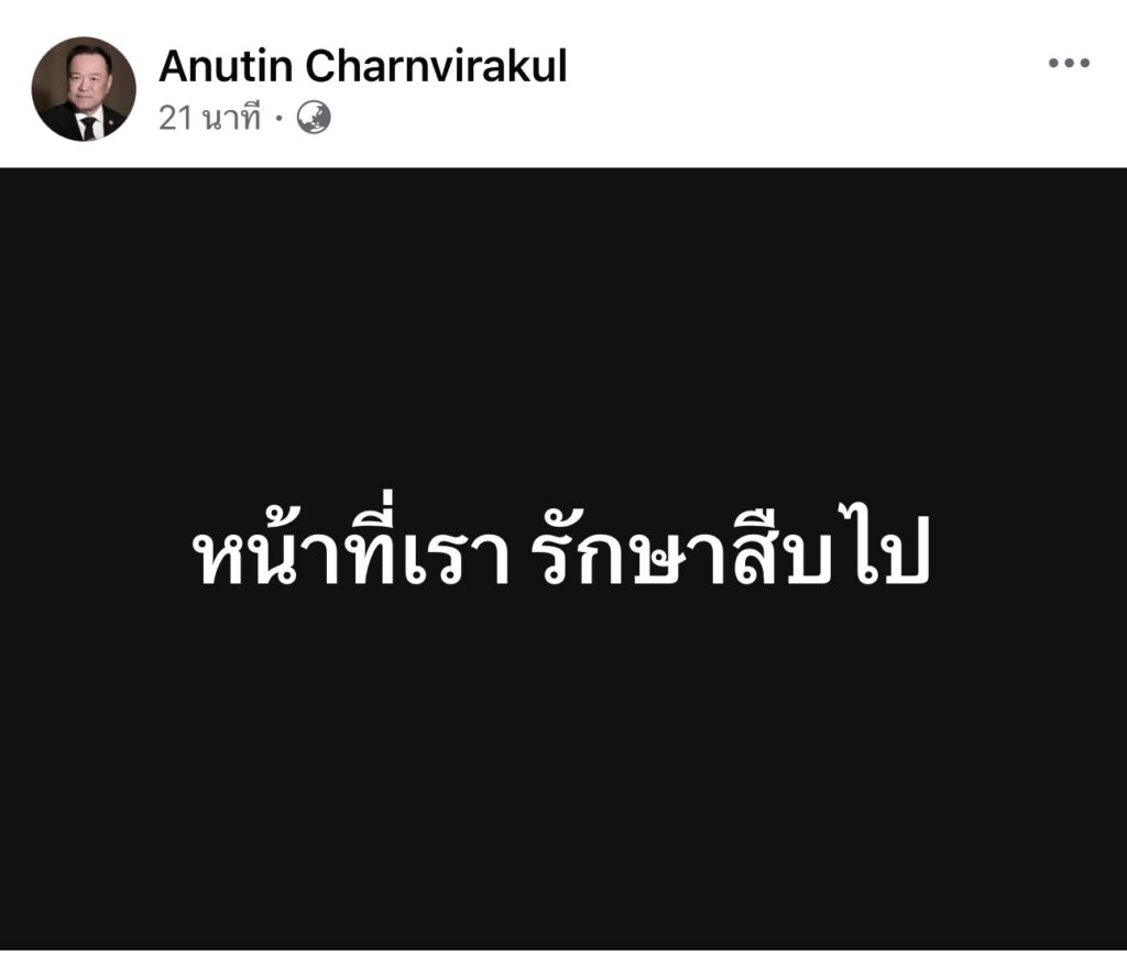 เมื่อเวลา 11.40 น. วันที่ 8 ธ.ค. นายอนุทิน ชาญวีรกูล นายกรัฐมนตรีและรมว.มหาดไทย โพสต์ข้อความผ่านเฟซบุ๊กระบุว่า “หน้าที่เรา รักษาสืบไป” ผู้สื่อข่าวรายงานว่า ข้อความดังกล่าวเป็นท่องหนึ่งของเพลงพระราชนิพนธ์ “เราสู้” ของรัชกาลที่ 9 ซึ่งเป็นเพลงปลุกใจที่ทรงพระราชทานเป็นของขวัญปีใหม่ให้แก่ทหาร อาสาสมัคร และตำรวจชายแดน