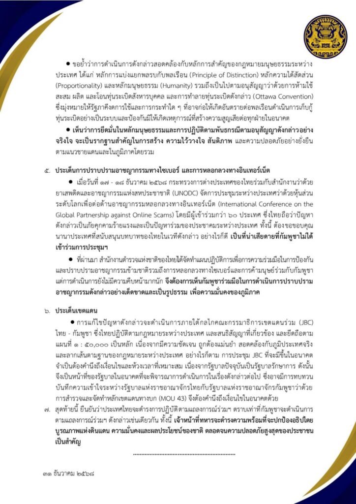 5.ประเด็นการปราบปรามอาชญากรรมทางไซเบอร์ และการหลอกลวงทางอินเทอร์เน็ต เมื่อวันที่ 17-18 ธ.ค.2568 กระทรวงการต่างประเทศของไทย ร่วมกับสำนักงานว่าด้วยยาเสพติดและอาชญากรรมแห่งสหประชาชาติ (UNODC) จัดการประชุมระหว่างประเทศว่าด้วยหุ้นส่วนระดับโลกเพื่อต่อต้านอาชญากรรมหลอกลวงทางอินเทอร์เน็ต (International Conference on the Global Partnership against Online Scams) โดยมีผู้เข้าร่วมกว่า 60 ประเทศ ซึ่งไทยถือว่าปัญหา ดังกล่าวเป็นภัยคุกคามร้ายแรงและเป็นปัญหาร่วมของประชาคมระหว่างประเทศ ทั้งนี้ ต้องขอขอบคุณนานาประเทศที่สนับสนุนบทบาทของไทยในเวทีดังกล่าว อย่างไรก็ดี เป็นที่น่าเสียดายที่กัมพูชาไม่ได้เข้าร่วมการประชุมฯ โดยที่ผ่านมา สำนักงานตำรวจแห่งชาติของไทยได้จัดทำแผนปฏิบัติการเพื่อการความร่วมมือในการป้องกันและปราบปรามอาชญากรรมข้ามชาติรวมถึงการหลอกลวงทางไซเบอร์และการค้ามนุษย์ร่วมกับกัมพูชาแต่การดำเนินการยังไม่มีความคืบหน้ามากนัก จึงต้องการเห็นกัมพูชาร่วมมือในการดำเนินการปราบปรามอาชญากรรมดังกล่าวอย่างเด็ดขาดและเป็นรูปธรรม เพื่อความมั่นคงของภูมิภาค