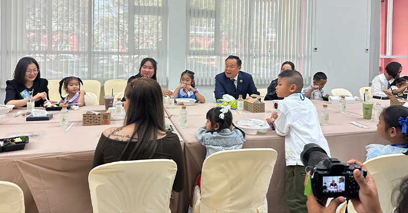 วันที่ 10 ม.ค. ที่ชั้น 1 อาคาร 44 สำนักเลขาธิการนายกรัฐมนตรี ทำเนียบรัฐบาล นายอนุทิน ชาญวีรกูล นายกรัฐมนตรีและรมว.มหาดไทย พร้อม น.ส.ธนนนท์ นิรามิษ ภริยา น.ส.ไตรศุลี ไตรสรณกุล เลขาธิการนายกรัฐมนตรี ร่วมรับประทานอาหารเที่ยงกับลูกและครอบครัววีรชน ที่เสียสละชีวิตจากเหตุปะทะชายแดนไทย-กัมพูชา 21 ครอบครัว 43 คน โดยมีเมนูอาหาร อาทิ ข้าวผัดทะเล ข้าวผัดปลาสลิตไข่ต้ม ข้าวคลุกกระเพรา สปาเก็ตตี้ขี้เมา ไก่บอนชอน เค้ก ซาลาเปา ไอศกรีม เป็นต้น
