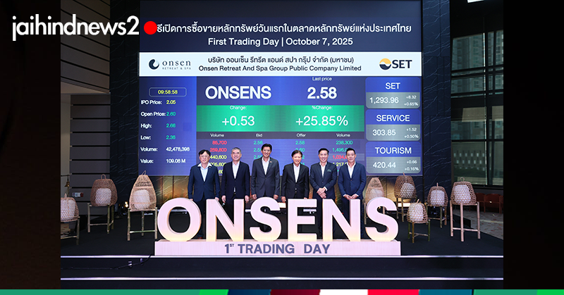 อัสสเดช คงสิริ กรรมการและผู้จัดการ ตลาดหลักทรัพย์แห่งประเทศไทย และ สมิทธิ์ เมฆอรุณกมล ประธานเจ้าหน้าที่บริหาร บมจ. ออนเซ็น รีทรีต แอนด์ สปา กรุ๊ป (ONSENS) ร่วมพิธีเปิดการซื้อขายวันแรกในตลาดหลักทรัพย์ฯ ในวันที่ 7 ตุลาคม 2568 ด้วยมูลค่าหลักทรัพย์ ณ ราคา IPO 615 ล้านบาท โดย ONSENS เป็นผู้ให้บริการออนเซ็นและสปาเพื่อสุขภาพ ภายใต้แบรนด์ “ยูโนะโมริ ออนเซ็น แอนด์ สปา” และ “คลาย สปา”