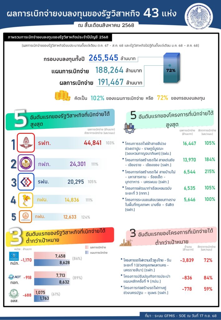 นายธิบดี วัฒนกุล ผู้อำนวยการสำนักงานคณะกรรมการนโยบายรัฐวิสาหกิจ (สคร.) เปิดเผยว่า การเบิกจ่ายงบลงทุนของรัฐวิสาหกิจที่อยู่ในการติดตามของ สคร. อย่างใกล้ชิด จำนวน 43 แห่ง แบ่งออกเป็น 2 กลุ่ม ได้แก่ กลุ่มรัฐวิสาหกิจที่ใช้ปีบัญชีตามปีงบประมาณ (รัฐวิสาหกิจปีงบประมาณ) และกลุ่มรัฐวิสาหกิจที่ใช้ปีบัญชีตามปีปฏิทิน (รัฐวิสาหกิจปีปฏิทิน) โดยในปี 2568 มีกรอบงบลงทุน จำนวน 265,545 ล้านบาท และมีผลการเบิกจ่ายสะสมตั้งแต่ต้นปีบัญชีจนถึงสิ้นเดือนสิงหาคม 2568 จำนวน 191,467 ล้านบาท หรือคิดเป็นร้อยละ 102 ของแผนการเบิกจ่าย ประกอบด้วยผลการเบิกจ่ายงบลงทุนของรัฐวิสาหกิจปีงบประมาณ (ตั้งแต่เดือนตุลาคม 2567 – เดือนสิงหาคม 2568) 34 แห่ง จำนวน 116,857 ล้านบาท หรือคิดเป็นร้อยละ 98 ของแผนการเบิกจ่าย และรัฐวิสาหกิจปีปฏิทิน (ตั้งแต่เดือนมกราคม 2568 – เดือนสิงหาคม 2568) 9 แห่ง จำนวน 74,610 ล้านบาท หรือคิดเป็นร้อยละ 108 ของแผนการเบิกจ่าย ทั้งนี้ รัฐวิสาหกิจปีงบประมาณที่เบิกจ่ายได้ไม่ต่ำกว่าร้อยละ 95