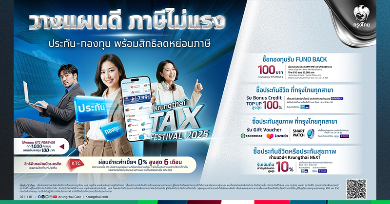 ธนาคารกรุงไทย ตอกย้ำความเป็นผู้นำด้านการลงทุน จัดแคมเปญใหญ่ส่งท้ายปี “Krungthai Tax Festival 2025 วางแผนดี ภาษีไม่แรง ใช้สิทธิ์ให้เต็ม ลดหย่อนให้คุ้ม” โดยคัดสรรผลิตภัณฑ์ประกันชีวิต ประกันสุขภาพ และการลงทุนแบบครบวงจร ที่ตอบโจทย์ทุกไลฟ์สไตล์การเงิน พร้อมเสริมสร้างความมั่นคงทางการเงิน และการวางแผนสิทธิลดหย่อนภาษีปลายปีได้อย่างคุ้มค่า