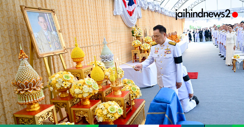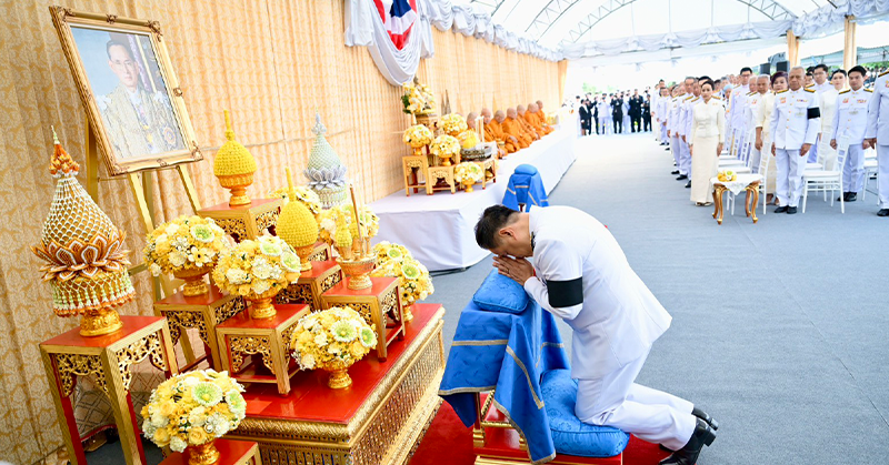 นายกรัฐมนตรีและภริยา เดินทางถึงบริเวณท้องสนามหลวง พระสงฆ์ จำนวน 10 รูป ขึ้นนั่งอาสน์สงฆ์ นายกรัฐมนตรีจุดเทียนบูชาพระรัตนตรัย จุดธูปเทียนเครื่องทองน้อยหน้าพระบรมฉายาลักษณ์ พระบาทสมเด็จพระบรมชนกาธิเบศร มหาภูมิพลอดุลยเดชมหาราช บรมนาถบพิตร เจ้าหน้าที่อาราธนาศีล พระสงฆ์ให้ศีล สวดพระพุทธมนต์