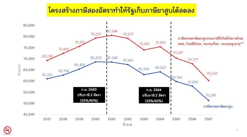 จึงมีความผิดหวังเป็นอย่างยิ่ง กับความผิดพลาดที่มีการปรับภาษีจากอัตราเดียวเป็น 2 อัตราในปี 2560 และแม้จะมีการปรับอัตราภาษีในปี 2564 ภาษีบุหรี่ก็ยังเป็น 2 อัตรา ซึ่งทำให้รายได้จากภาษีบุหรี่ยิ่งลดลงไปอีก