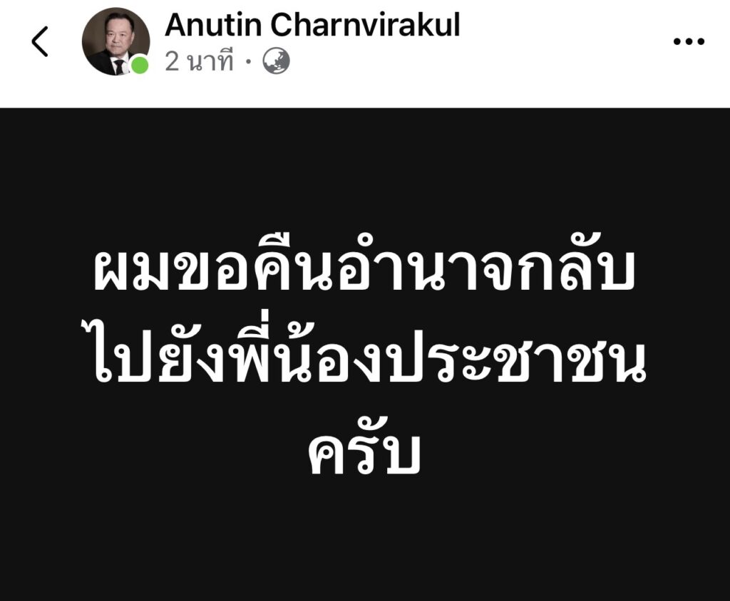 เมื่อเวลา 22.00 น.วันที่ 11 ธ.ค. ผู้สื่อข่าวรายงานว่าภายหลังมีกระแสข่าวว่านายอนุทิน ชาญวีรกูล นายกรัฐมนตรี และรมว.มหาดไทย ได้ทูลเกล้าฯ ร่างพระราชกฤษฎีกายุบสภาไปแล้วตั้งแต่ช่วงเย็นวันนี้ ล่าสุดนายอนุทิน โพสต์ข้อความผ่านเฟซบุ๊ก ระบุว่า“ ผมขอคืนอำนาจกลับไปยังพี่น้องประชาชนครับ”