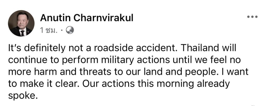 เมื่อเวลา 09.30 น.วันที่ 13 ธ.ค.นายอนุทิน ชาญวีรกูล นายกรัฐมนตรีและรมว.มหาดไทย โพสต์ข้อความผ่านเฟซบุ๊กเป็นภาษาอังกฤษระบุว่า “ It’s definitely not a roadside accident. Thailand will continue to perform military actions until we feel no more harm and threats to our land and people. I want to make it clear. Our actions this morning already spoke”